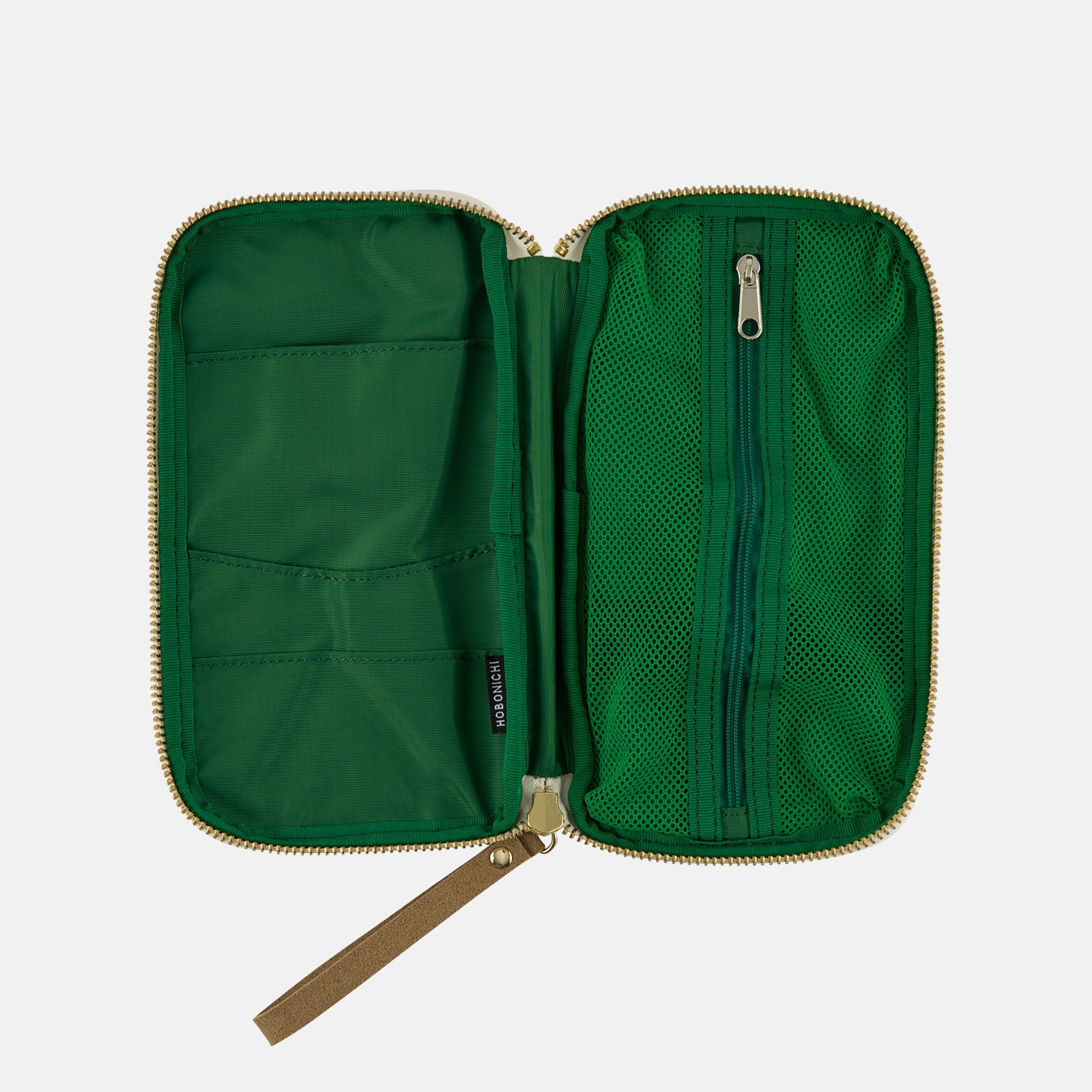 The Small Drawer Pouch is the size of a long wallet and fits writing utensils, cards, charging cables, and other slim items. The pouch can lay open completely flat when it’s unzipped, making it easy to glance inside and grab what you need.