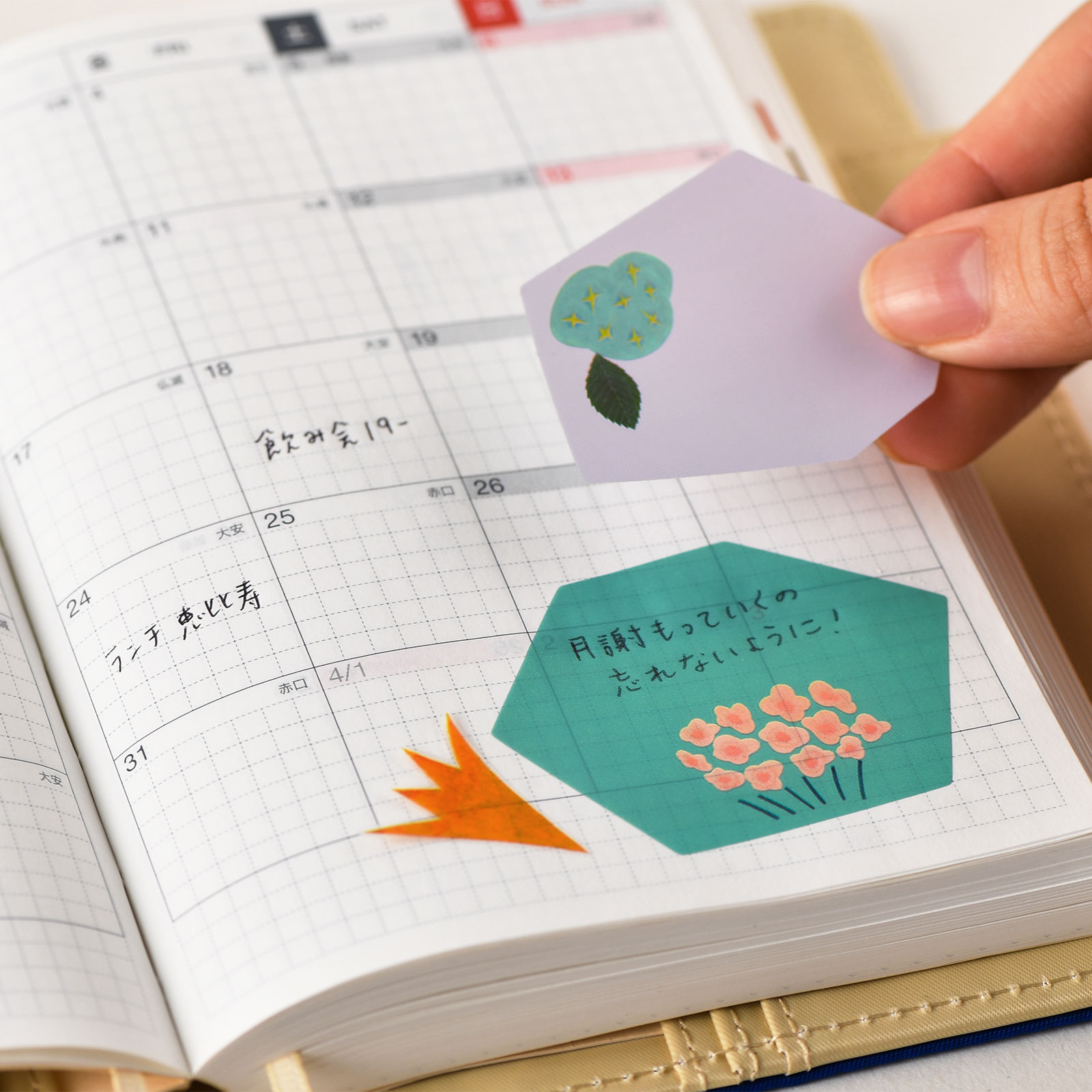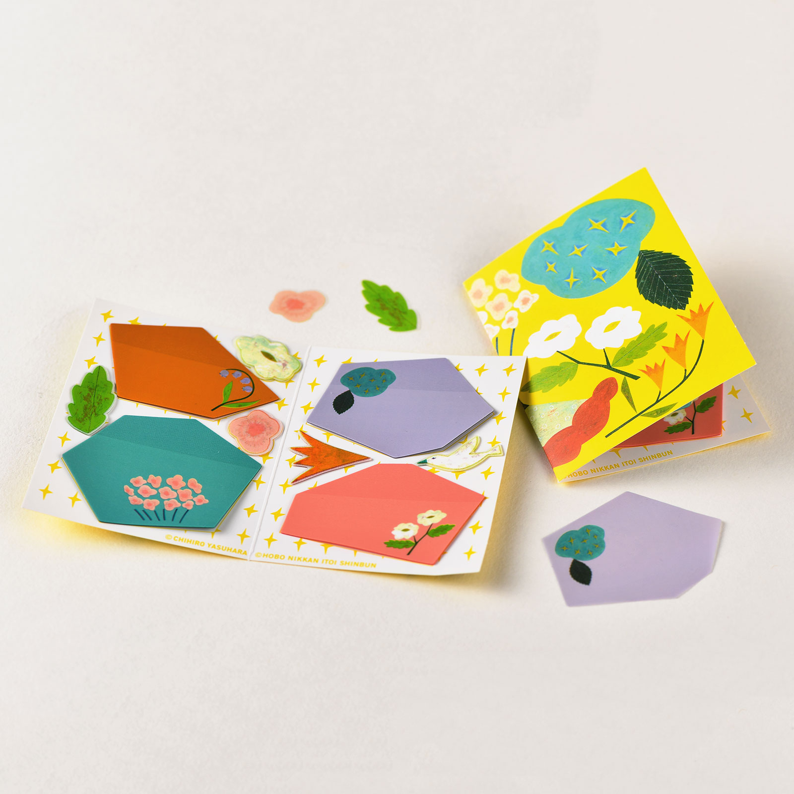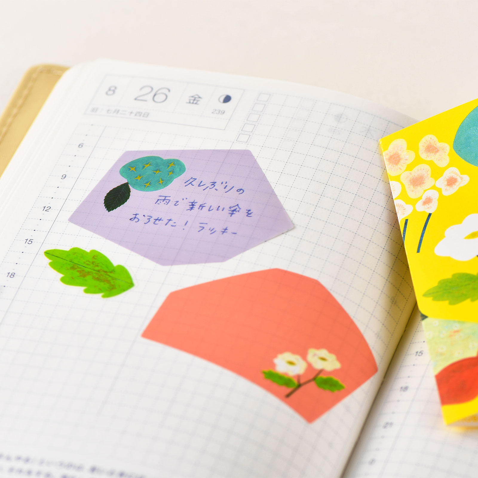 The pentagonal and hexagonal shapes are illustrated with an array of flowers, such as lilies of the valley and hydrangeas. Stickers in the shape of flower petals, leaves, and birds are also available for such versatile uses as decorating pages or making bookmarks or index tabs. The card-size holder folds up to fit nicely into the Hobonichi Techo cover pocket.