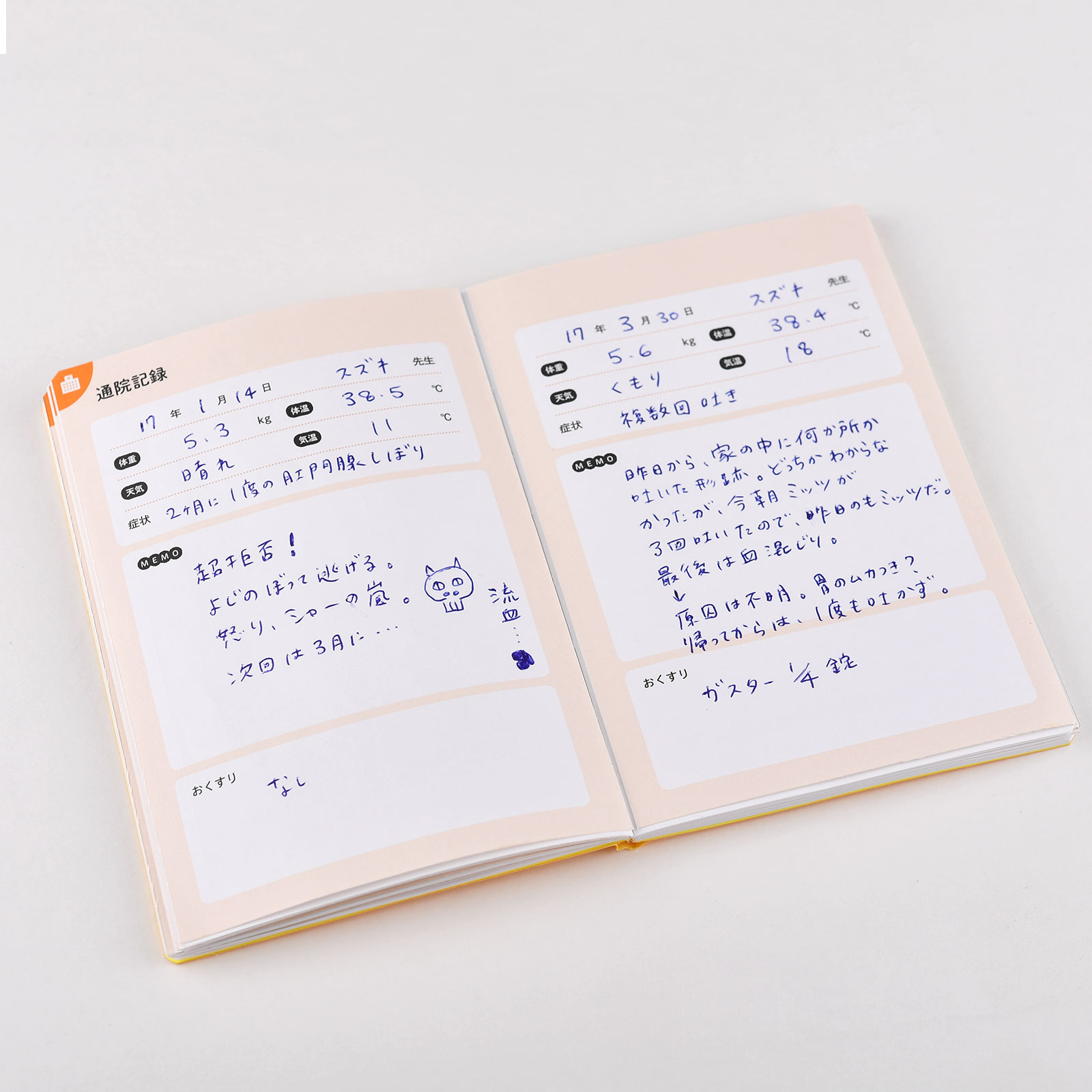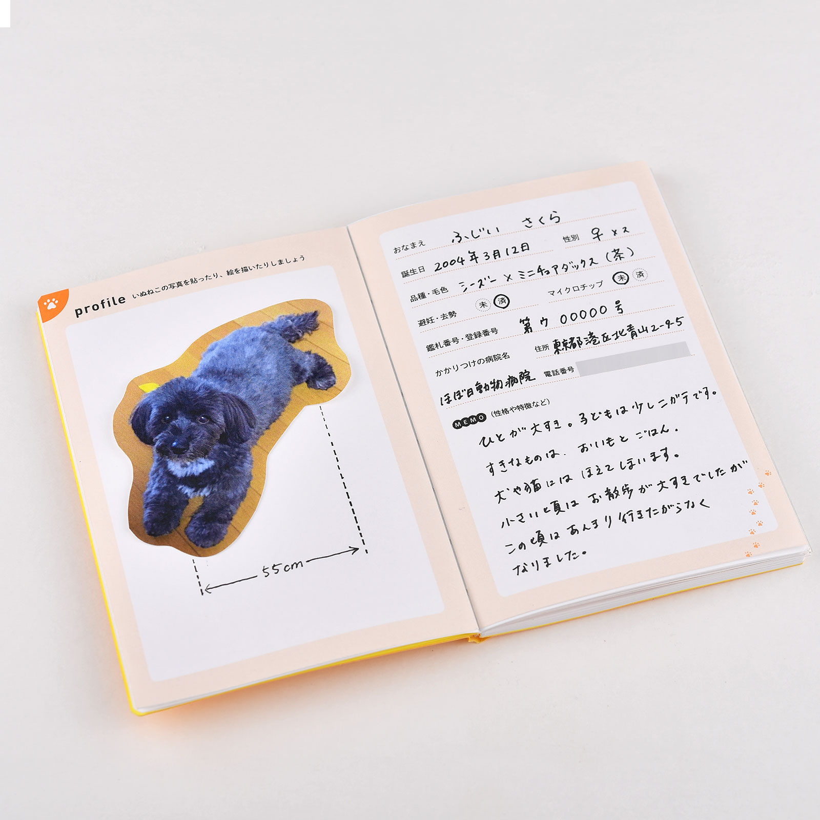 This booklet includes 64 pages for reading basic information, recording vaccinations and appointments, listing a pet’s diet, tracking weight changes, and checking on general observations. Pages are written in Japanese and do not include English labels.