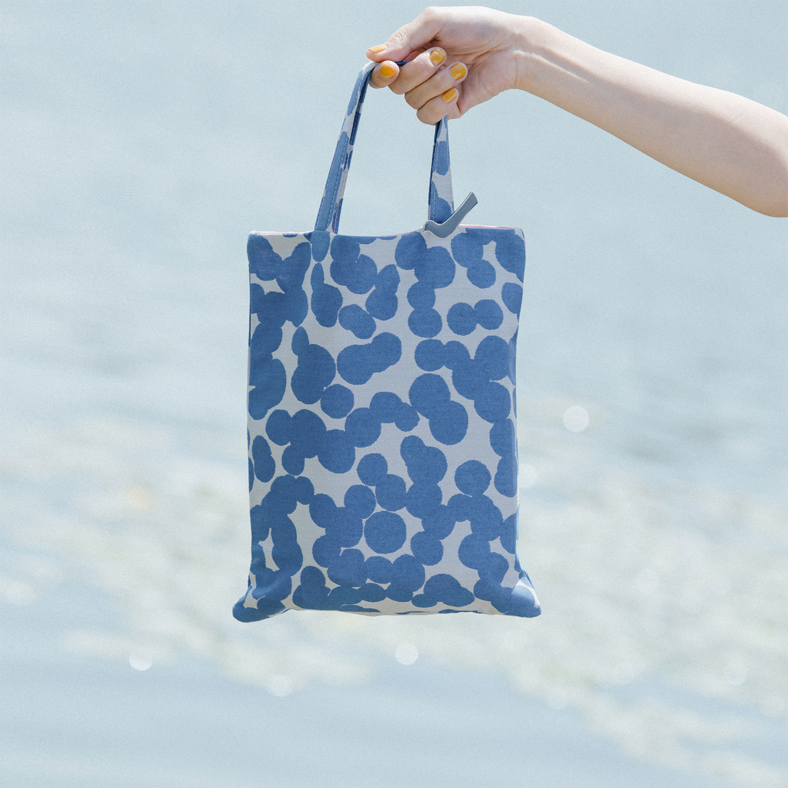 The soda water tote bag is non-gusseted. Each blue dot in the Jacquard weave textile is woven in a different direction, giving the pattern a unique sense of motion.