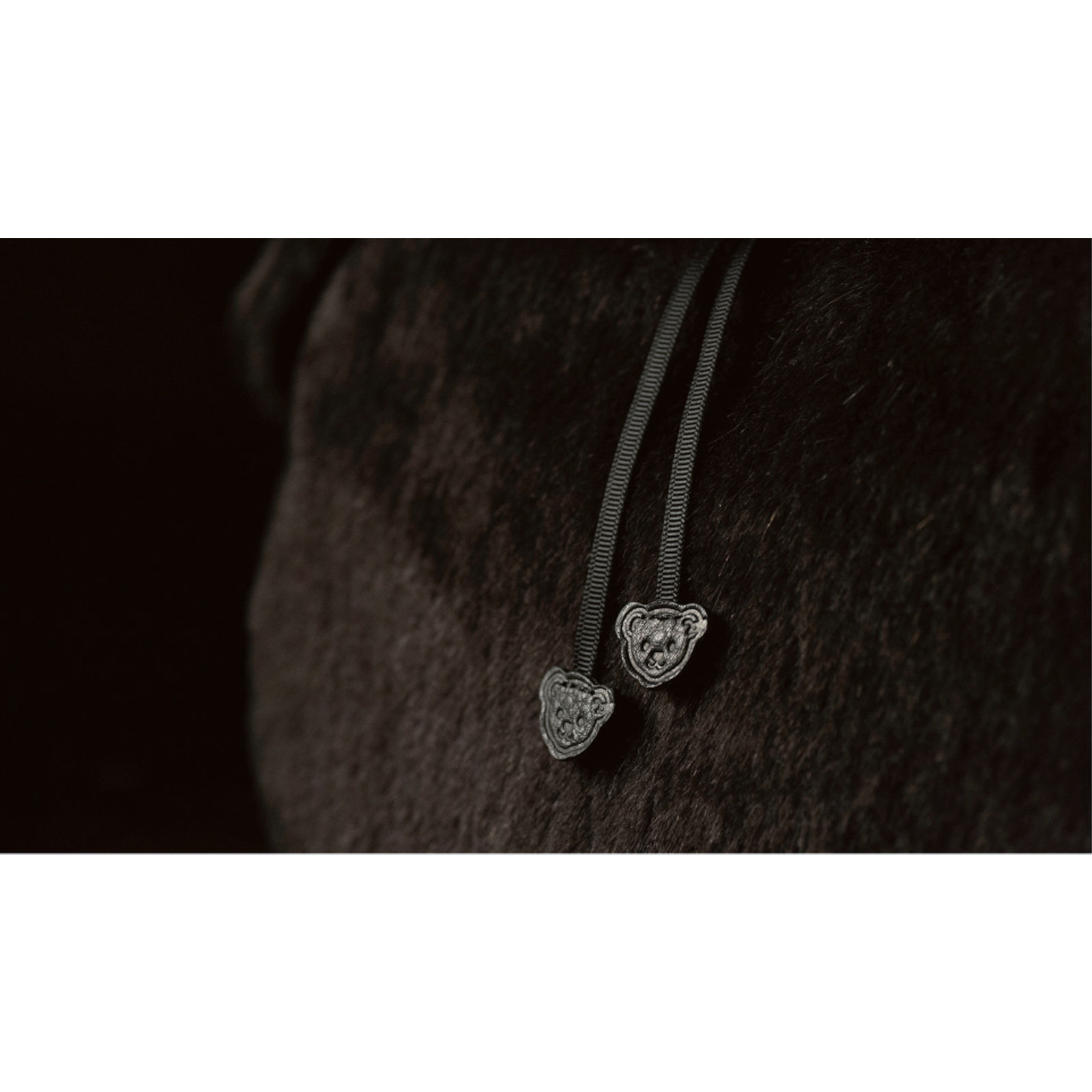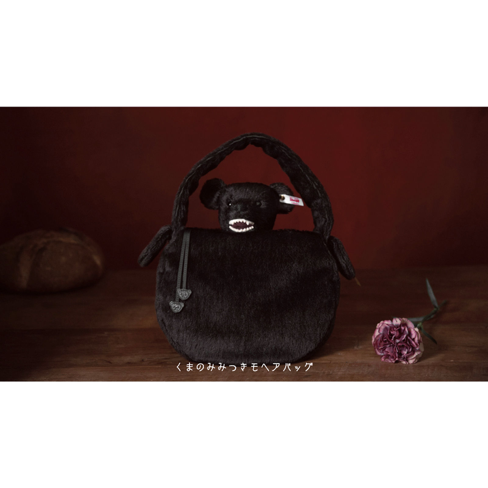 The button and tag attached to the left ear of the bag together make the “Button in Ear,” a trademark of Steiff products. The tag designates that the product has passed the maker’s strict quality standards before being imported into Japan from Germany. The German inscription on the tag “Knopf im Ohr” means “Button in Ear.” This bag is extremely rare in that it bears this trademark, as Steiff has historically reserved the distinct honor for its plush toys.
