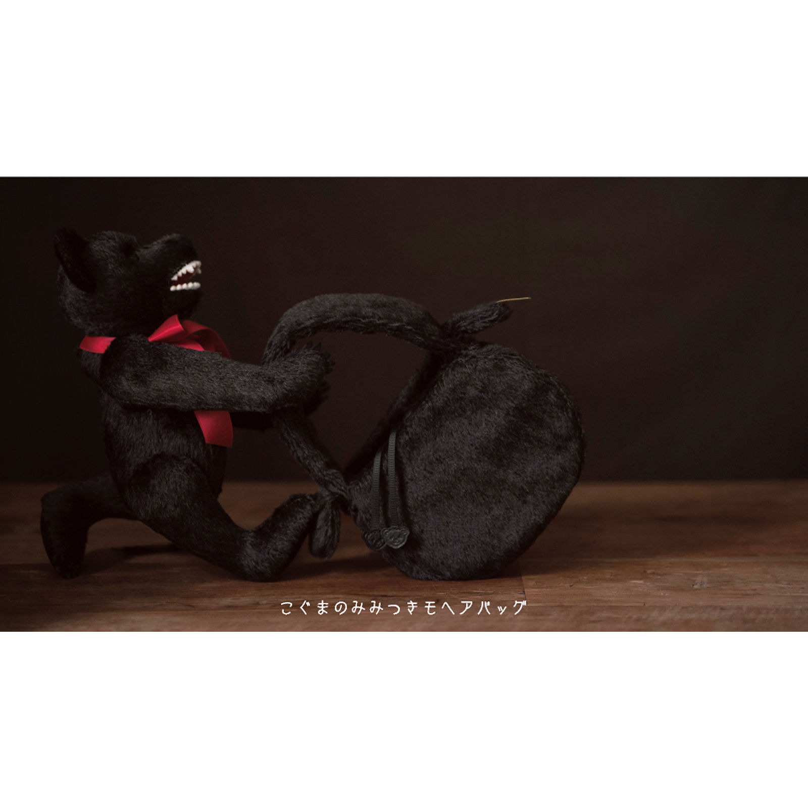 Open and close the bag with drawstrings, each with teddy bear-shaped charms made of black leather.