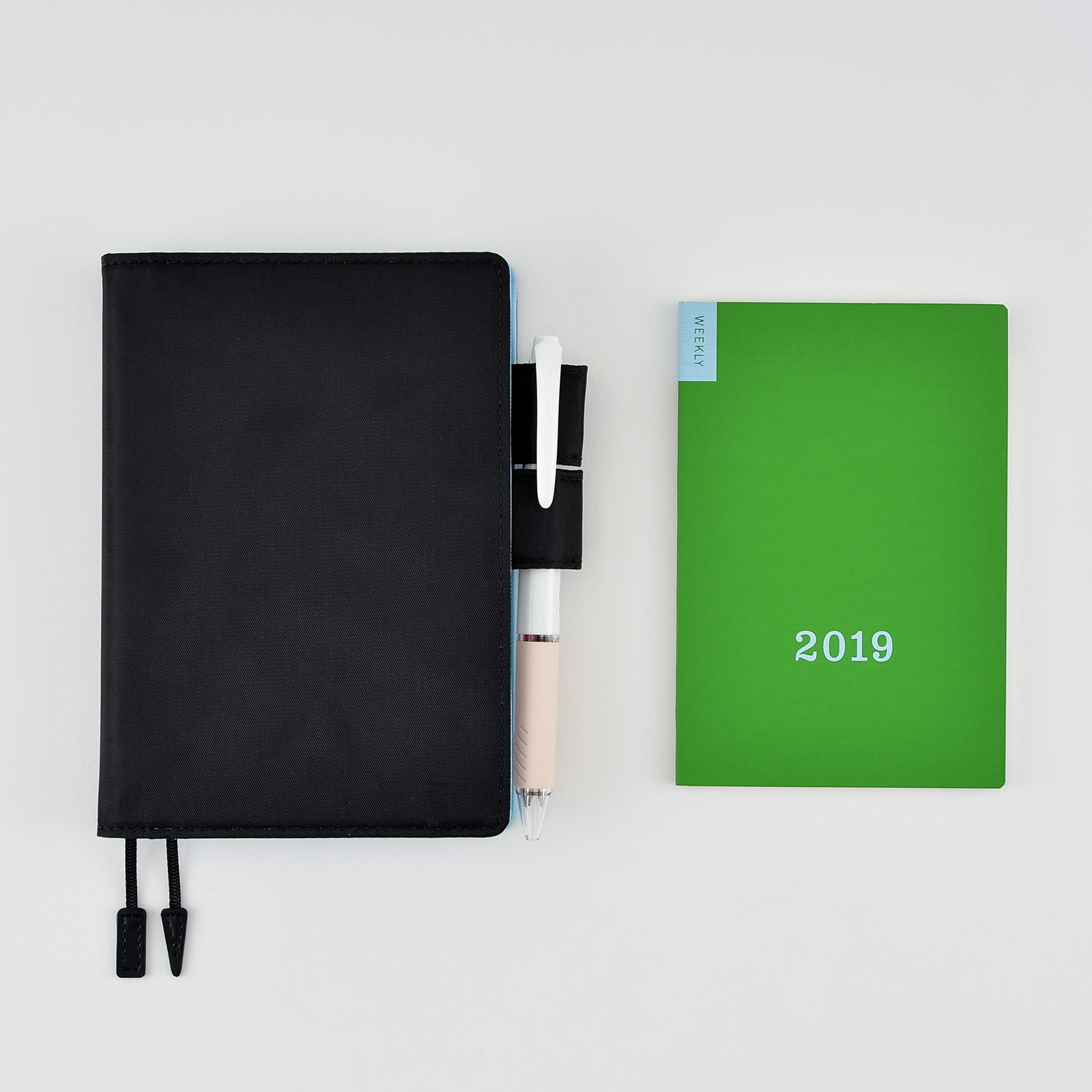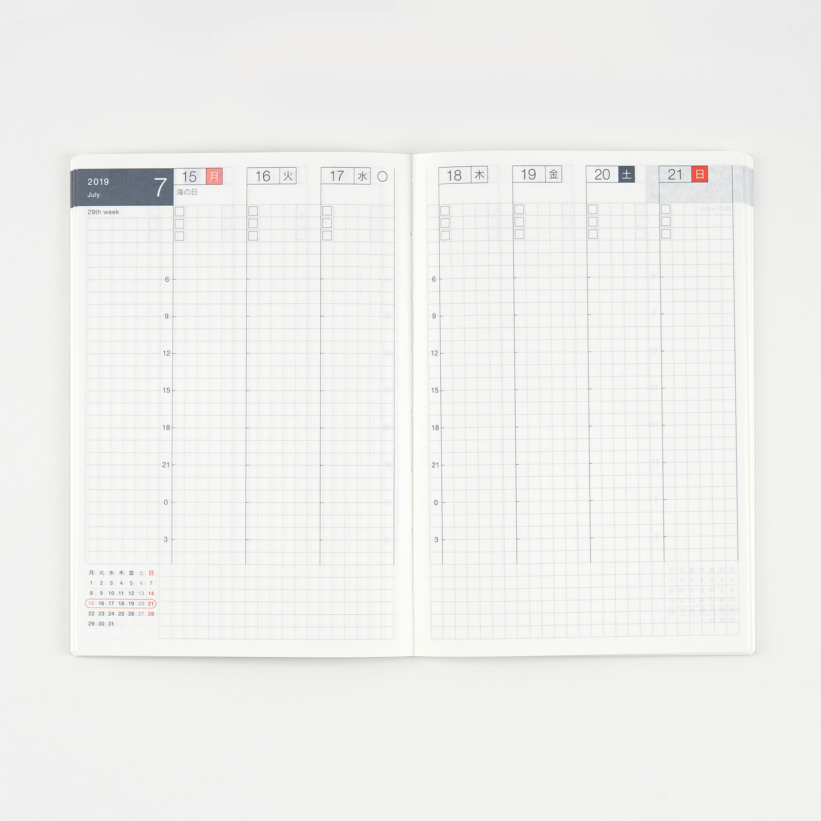 This weekly calendar is a supplement to the A6 Hobonichi Techo Planner / Original. Each two-page spread covers an entire week, and the booklet covers an entire year. Each daily column includes a full 24-hour timeline and three checkboxes at the top.