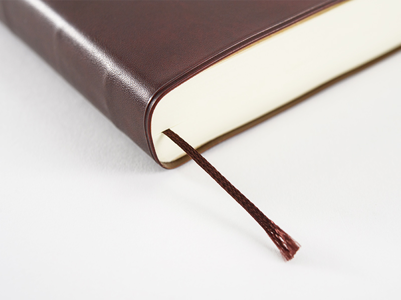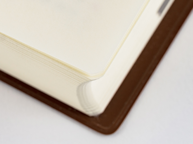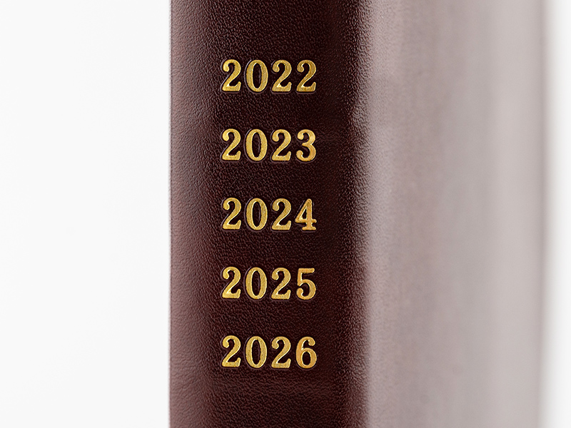 The soft, slightly textured brown cover rests nicely in your hands, and the cover material is reminiscent of some softcover dictionaries and bibles. The name “Hobonichi 5-Year Techo” and the years are foil-pressed on the cover in gold.