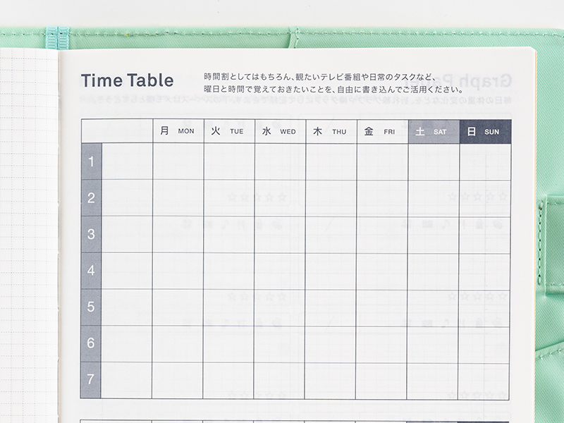 The book includes two timetables for writing in a recurring hourly schedule for each day of the week. These are useful, say, for filling in the broadcast times of favorite television shows, or splitting up house chores.