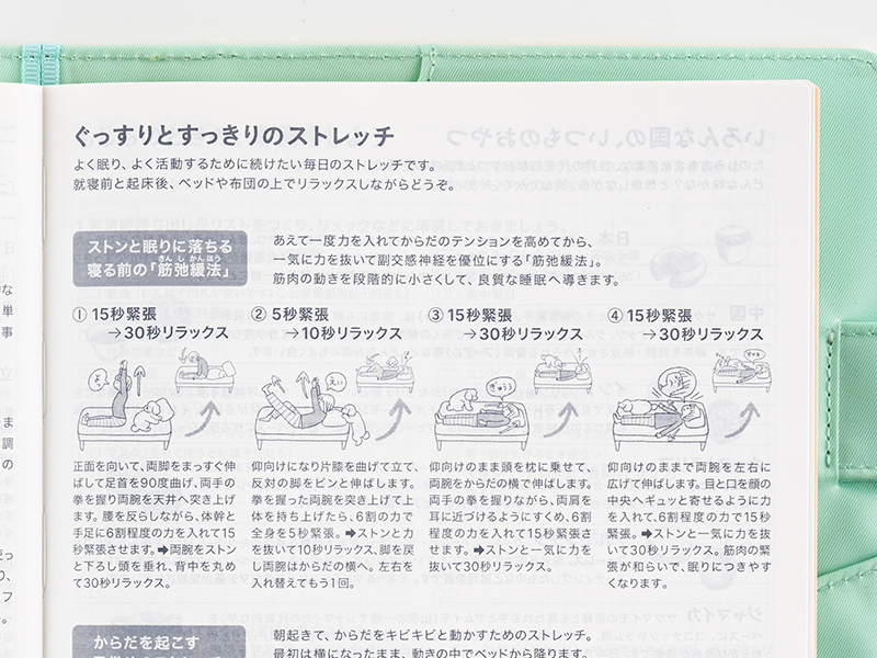 A set of daily stretches introduced by physical trainer Nakano James Shuichi paired with cute illustrations by Noriko Arai. These stretches are designed to help you relax on your bed before sleep and start the day refreshed after waking up.
