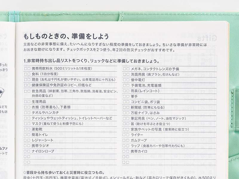 This page contains a checklist of items to have ready in case of an emergency. There is also a space to list nearby evacuation zones (common in Japan), emergency contact information and topics discussed between family and friends.