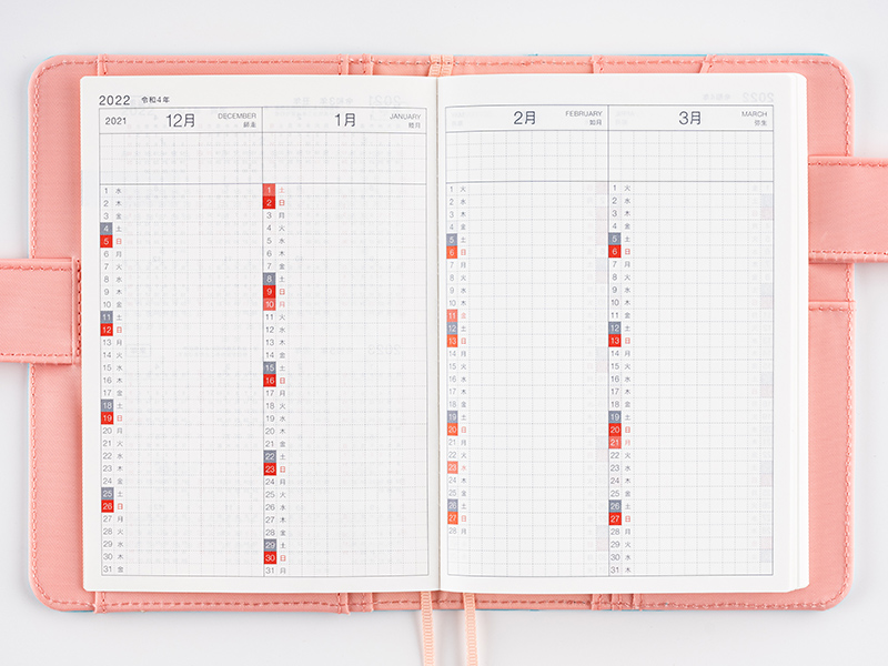 The yearly index covers 4 months per page for a total of 16 months, allowing users to track long-term plans and information (the A5 Cousin size covers 6 months per 2 page spread for a total for 12 months). The top of each monthly column includes 4 lines of space for recording any kind of information, such as that month’s goals or commitments, or drawing in checkboxes for a to-do list.