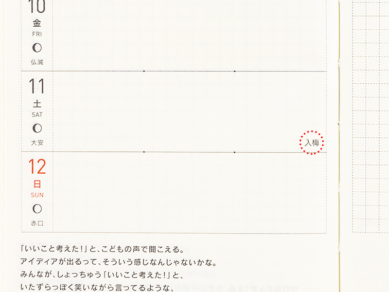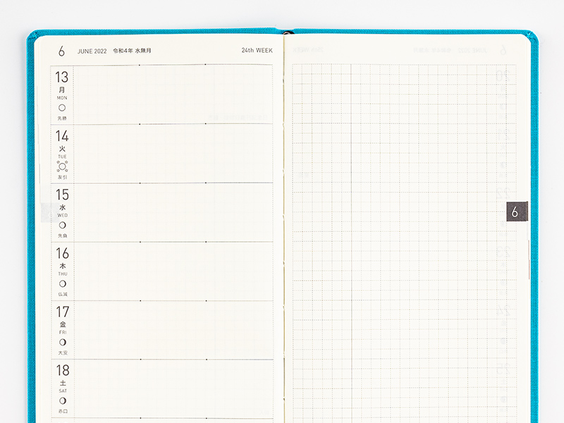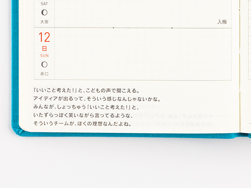 From the heartfelt to the humorous to the whimsical, each weekly spread of the planner features a quote specially selected from the planner’s parent site, Hobo Nikkan Itoi Shinbun. The quotes for the Weeks version are only in Japanese. If you would like the quotes in English, please buy the Hobonichi Techo Planner.