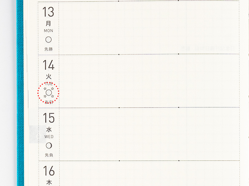 In order to facilitate the most efficient use of the limited space in each day, we’ve included two subtle dots to split each day into morning, afternoon, and evening. You can use these however you see fit, such as writing plans in the two left spaces and random notes in the one right space, or disregarding the dots altogether.
