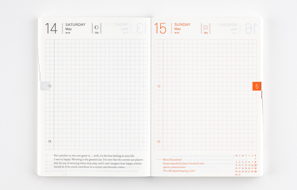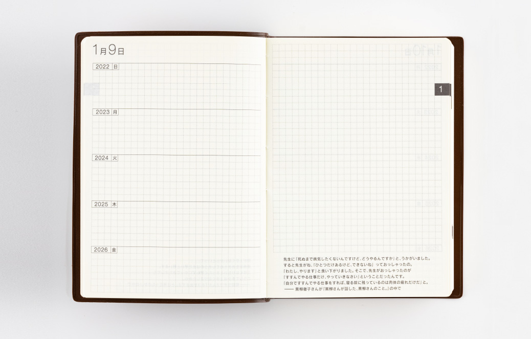 The Hobonichi Techo’s graph-paper design helps keep your writing straight whether you’re writing vertically or horizontally and makes drawing charts or graphs easy, too. The 3.7 mm grid size was the result of extensive testing to find the ideal size for comfortable writing.