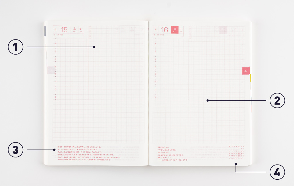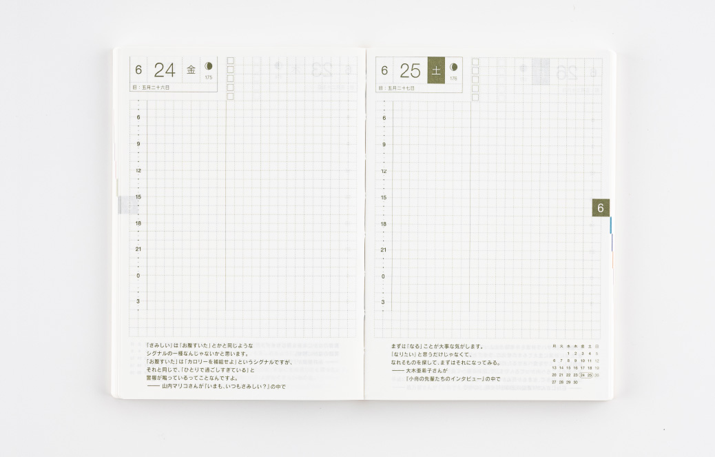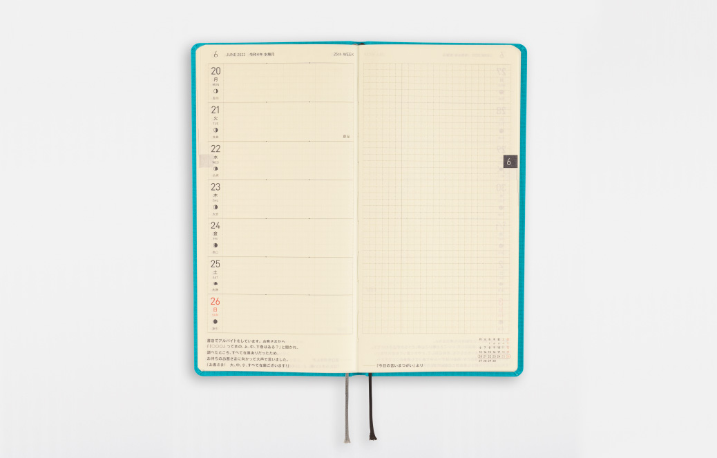 You can see all the basic features of the Hobonichi Techo in this layout from the Original. Each feature has received years of careful consideration.