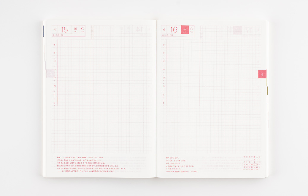One feature unique to the Hobonichi Techo is the collection of insightful and entertaining quotes on the pages, all of them specially selected from the techo’s parent site, Hobo Nikkan Itoi Shinbun. The techo is fun to write in, but thanks to its daily quotes it’s also fun to read.