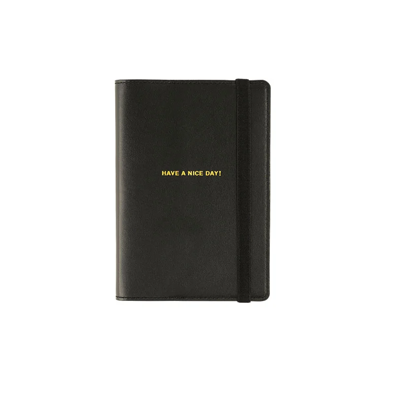 The color is black, and the textile used is a lightweight faux leather. The front cover features the words “Have a nice day!” foil pressed in gold.