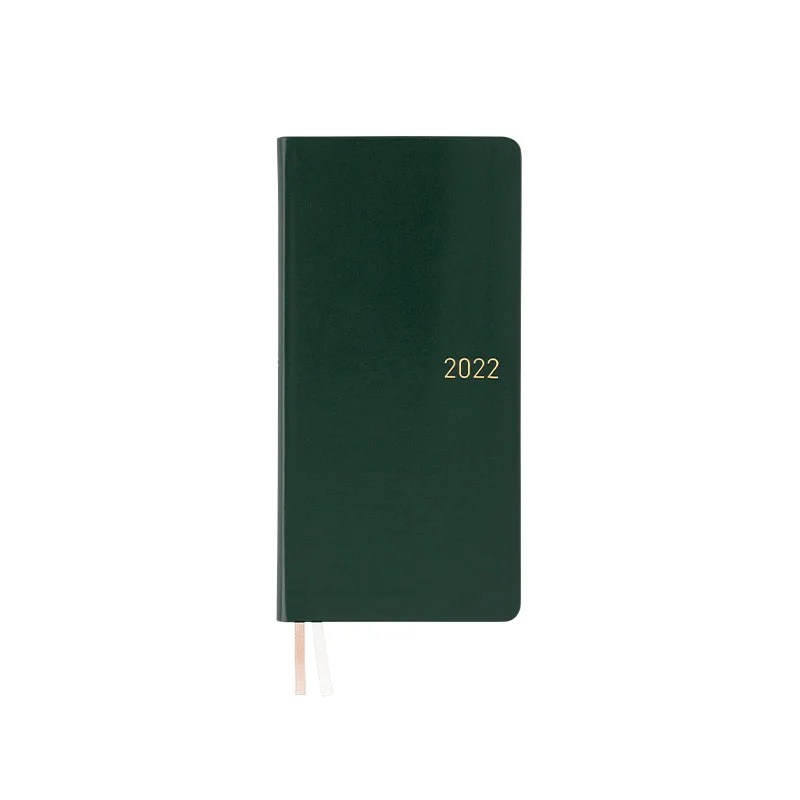 Evergreen’s leather has been dyed a deep shade of green. The calming color scheme gives the book an intellectual feel. The year 2022 is foil-pressed in gold onto the cover to add a glint in the right light.