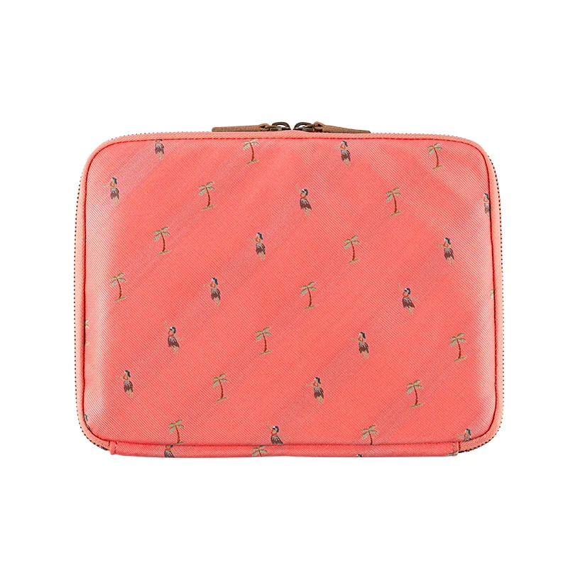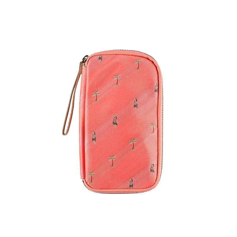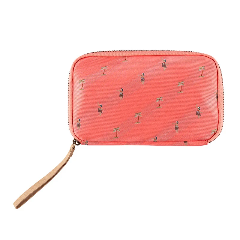 Hula features palm trees and hula girls embroidered on woven necktie material. The background is a gorgeous coral pink, and some of the dancers have their hands raised as they hula dance to the rhythm of the music. The pouch interior is beige.