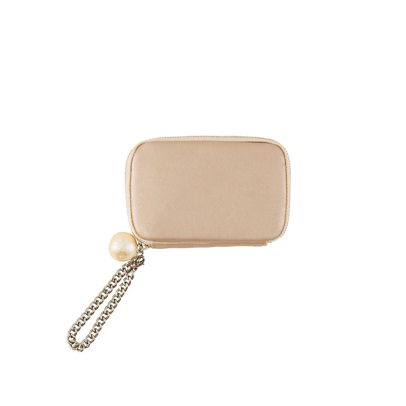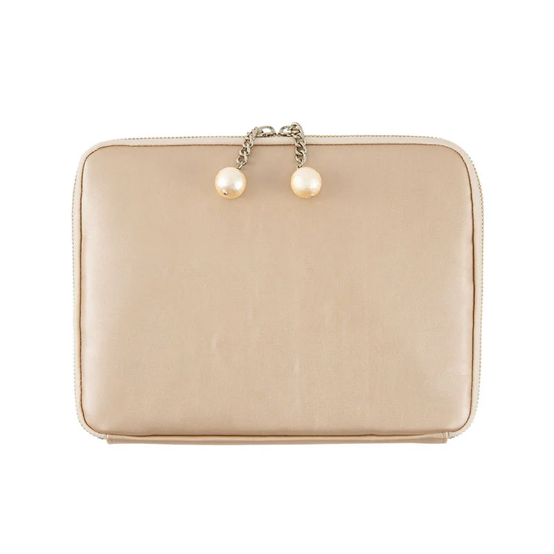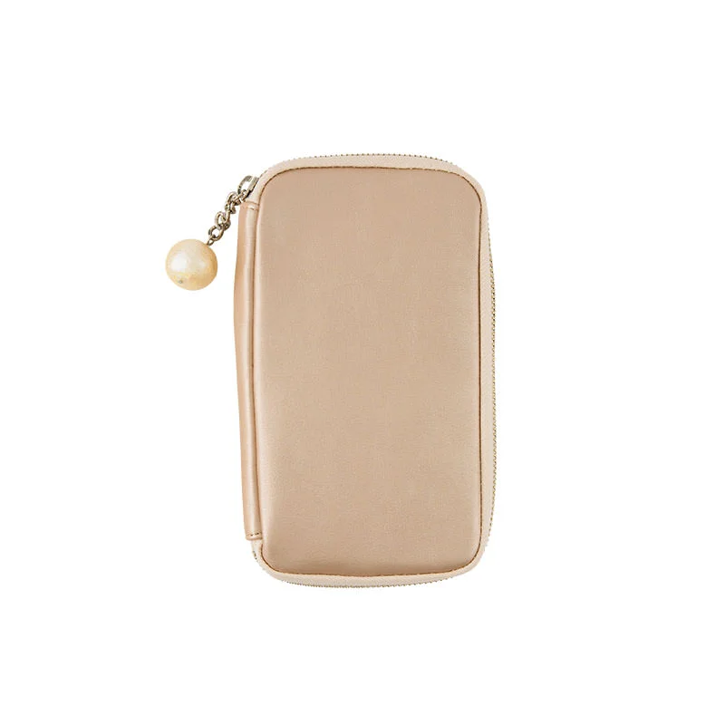 Champagne Pearl pairs a champagne gold faux leather with a cotton pearl and chain. The color scheme is a bit subdued, but it still dazzles when the light hits it just right. The cotton pearls are relatively large and combine with the chain to give the pouch a gorgeous, luxurious feel. The interior is off white. Holding this pouch in your hand will fill your ordinary days with joy and beauty.