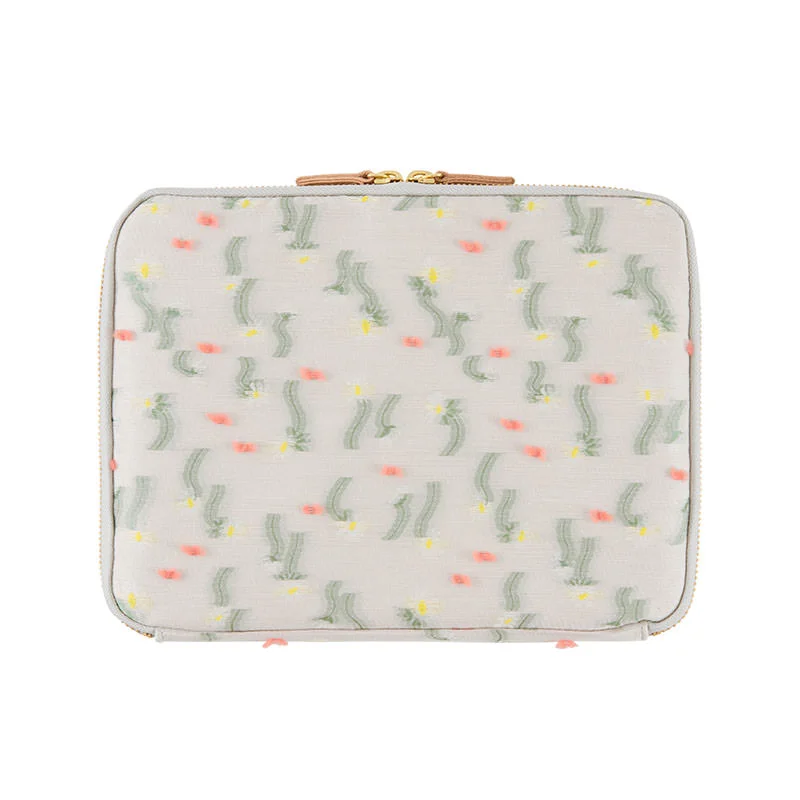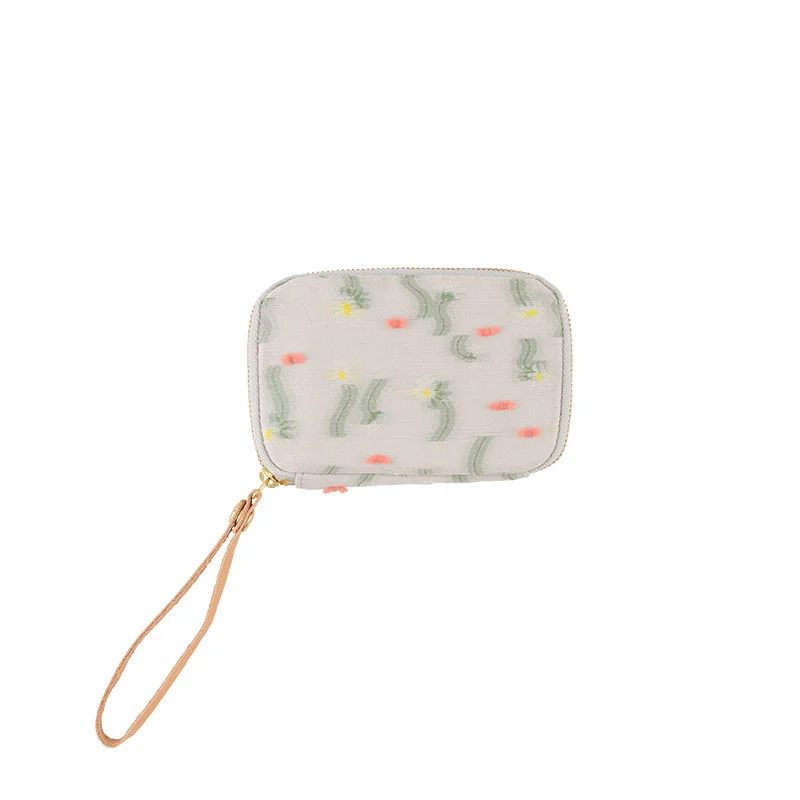 The Dreaming Garden textile from Makino Collection overlays white flowers against a light gray base material. Embroidered areas around the flower stems are done in a green so light that it looks like an afterimage effect on this dreamy design. Fluffy salmon-pink threads around the flowers and stems were woven into the textile at the time of production. These complex textures were created in Kiryu City, Gunma Prefecture. The entire process is laborious, from start to finish—before washing the textile, all the excess threads were trimmed. The interior is salmon pink, and the zipper pull is natural leather.