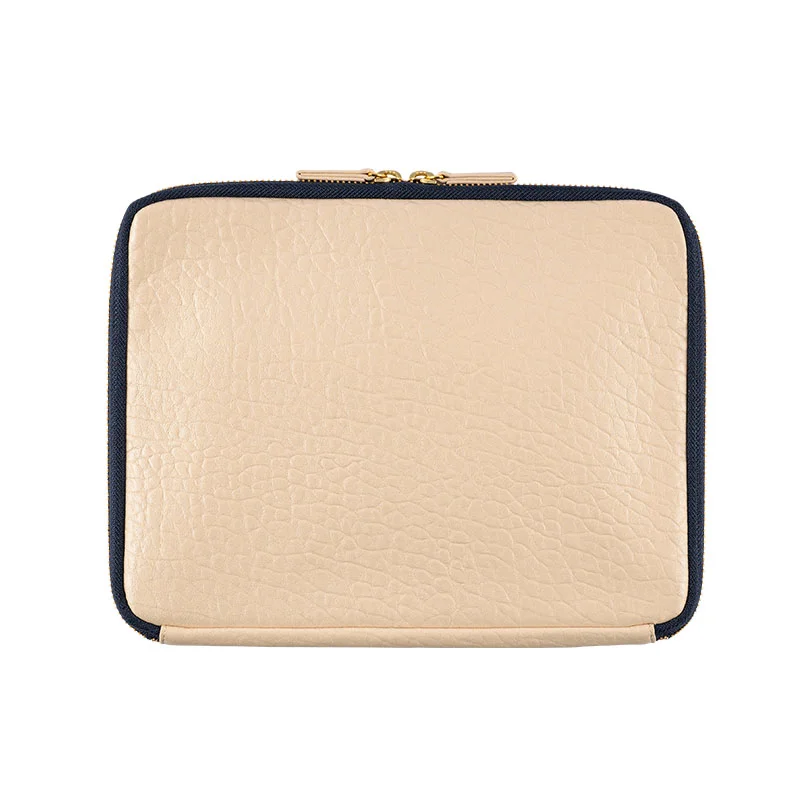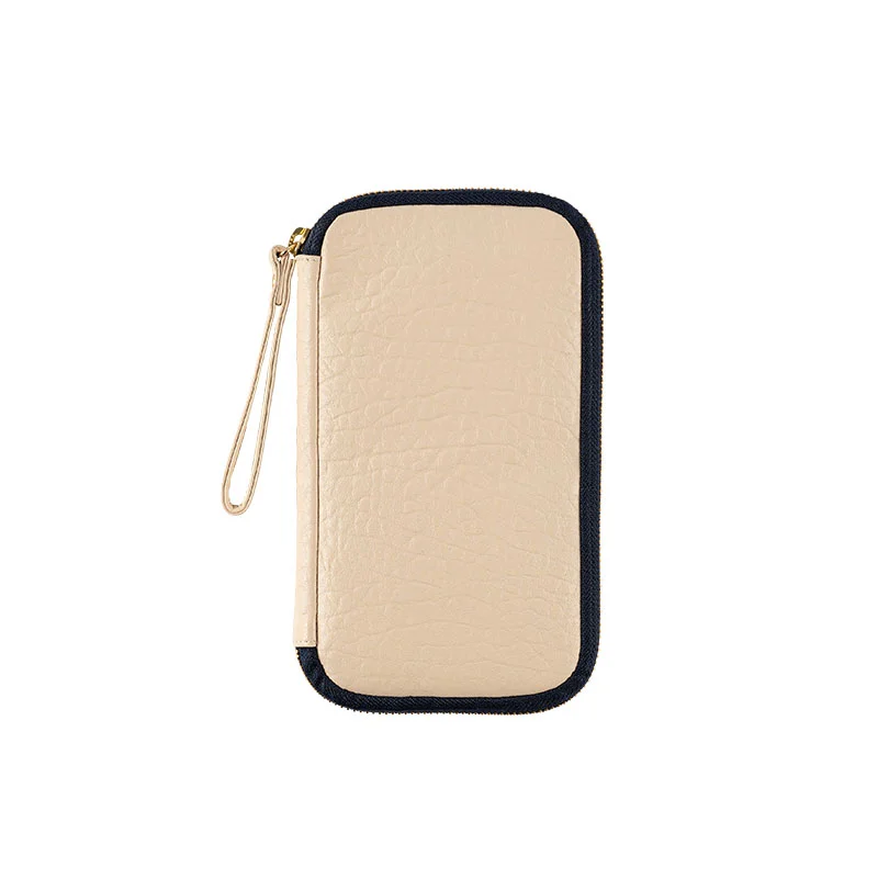 TS Bubble Sheep uses a soft sheep leather made in France, giving the pouch a top-quality feel. The leather was previously featured in the TS 2019 - Bubble Sheep techo cover, and is pliable and extremely soft. The color is a nuanced ivory hue, which is paired with a navy border and interior. We’ve kept the material as natural as possible in order to focus heavily on how wonderful it feels to the touch, so the leather is delicate. We recommend avoiding cleaning the leather other than lightly wiping it with a dry cloth. Also, due to the unique characteristics of leather, the size and depth of naturally created patterns vary per item.