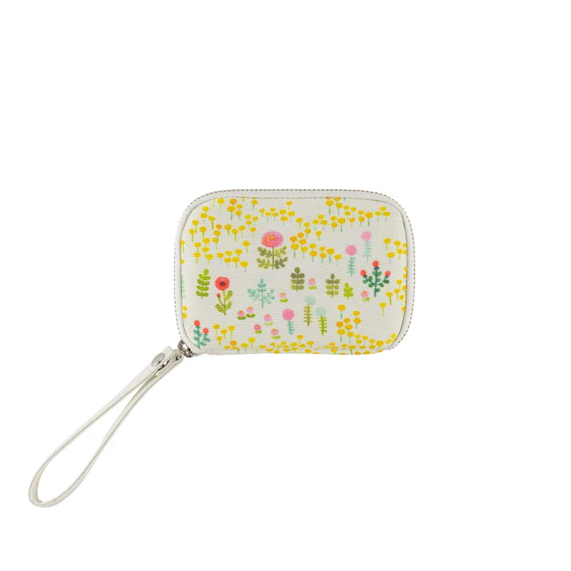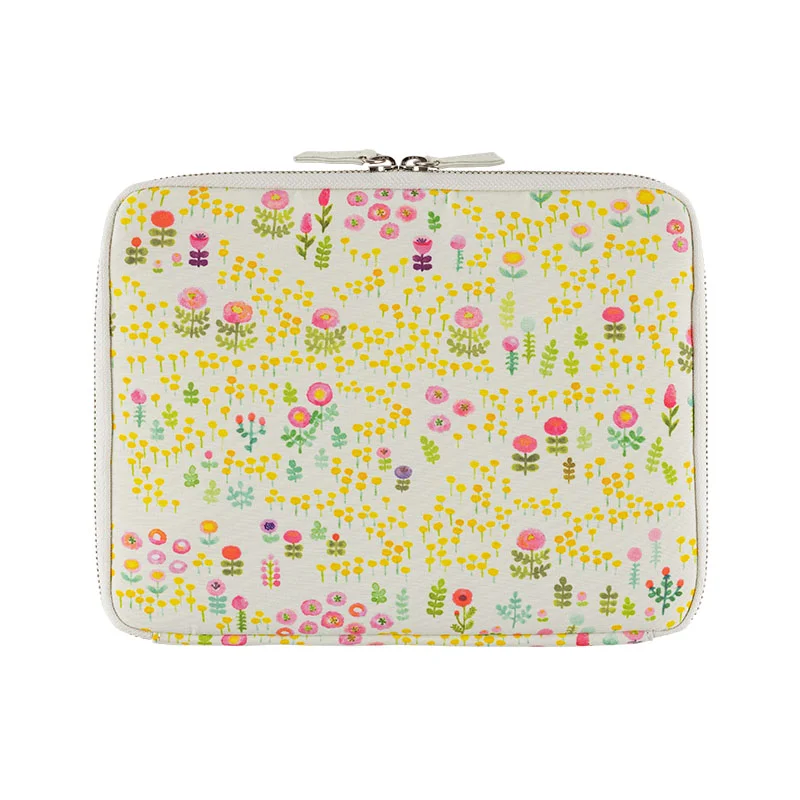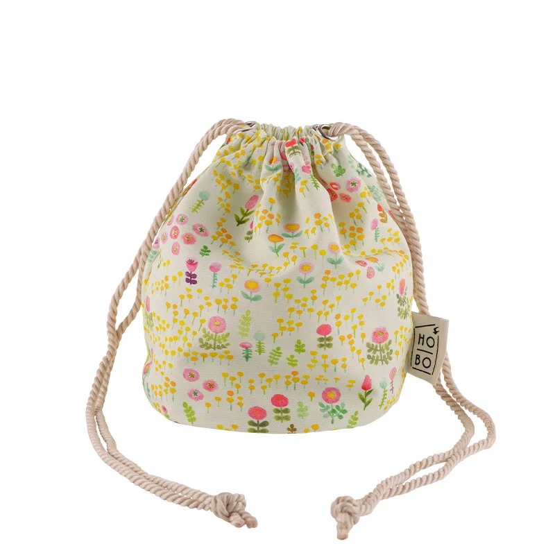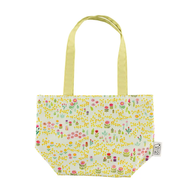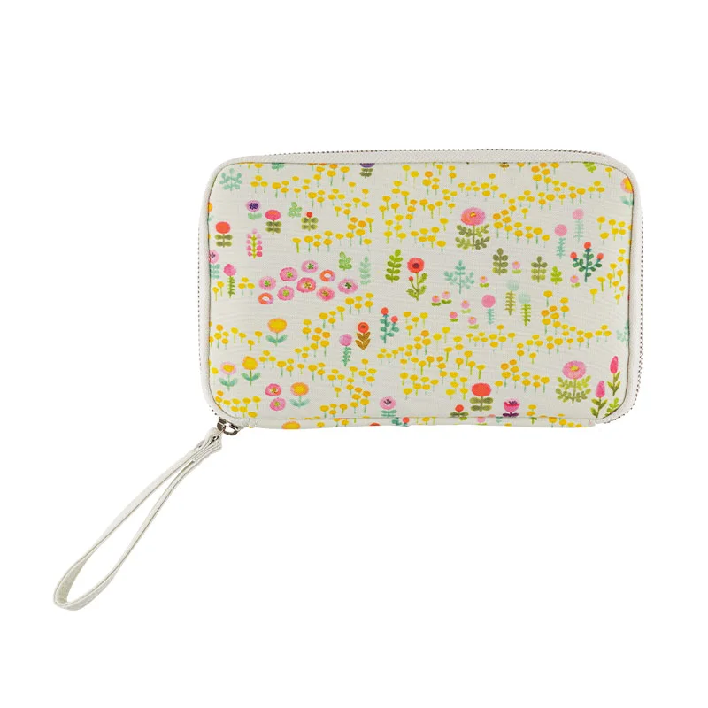 This printed fabric was illustrated by Aki Kondo, who is famous for creating picture books, coming up with the concept for Rilakkuma, and creating the characters Mofy the rabbit, woo and wah, and Ofuton-san. There’s a soft, mint blue background and a host of yellow and red flowers painted in watercolor to cheer you up. The interior is a vivid pink.