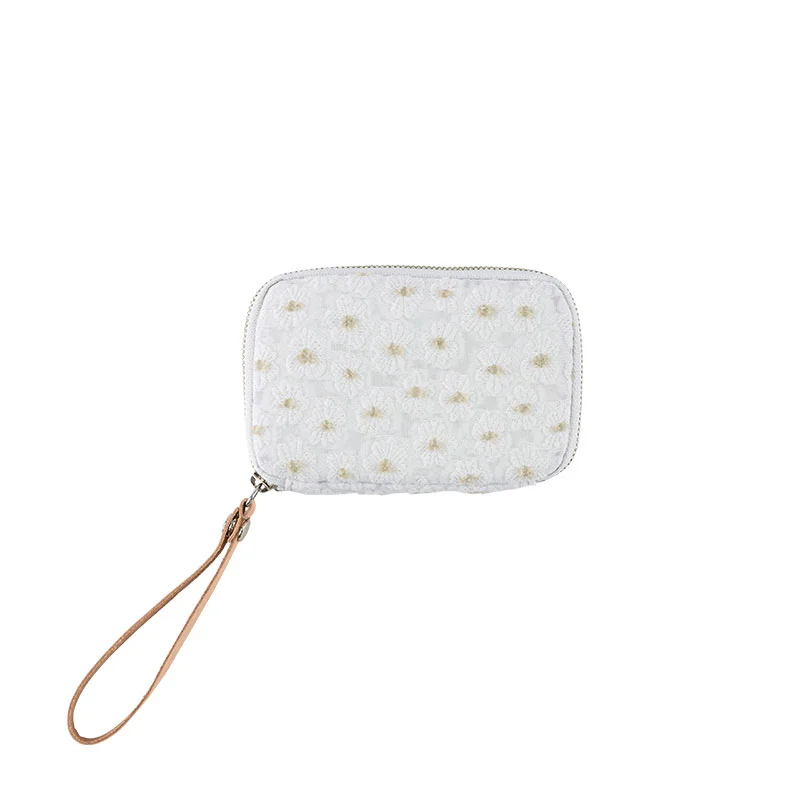 The beige petals are not sewn onto the fabric afterwards but are woven into the textile at the time of production. This textile is packed with traditional techniques despite its delicate look. The zipper pull contains a looped strap for easy handling.