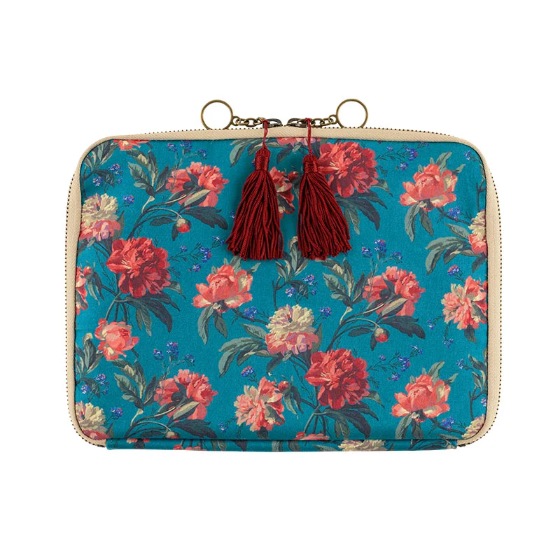 Decadent Blooms features a textile from Liberty Fabrics, which has fans all over the world. The dusky turquoise is printed with big peonies, roses, and forget-me-nots for a gorgeous, exotic look. The cover interior is beige, and the zipper pull includes a dark red tassel.