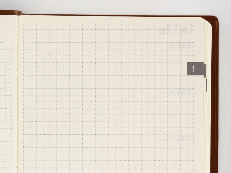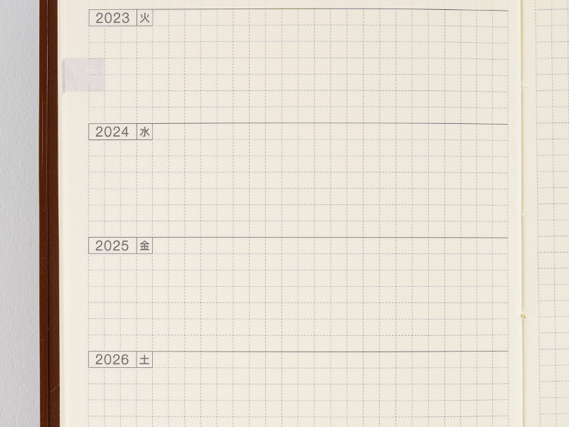 The basic format of the 5-Year Techo has the same date across five years listed on the left side, and a blank graph paper memo page on the right. The layout is flexible enough to allow users to either fill in their pages the same way every day or mix things up as they go.