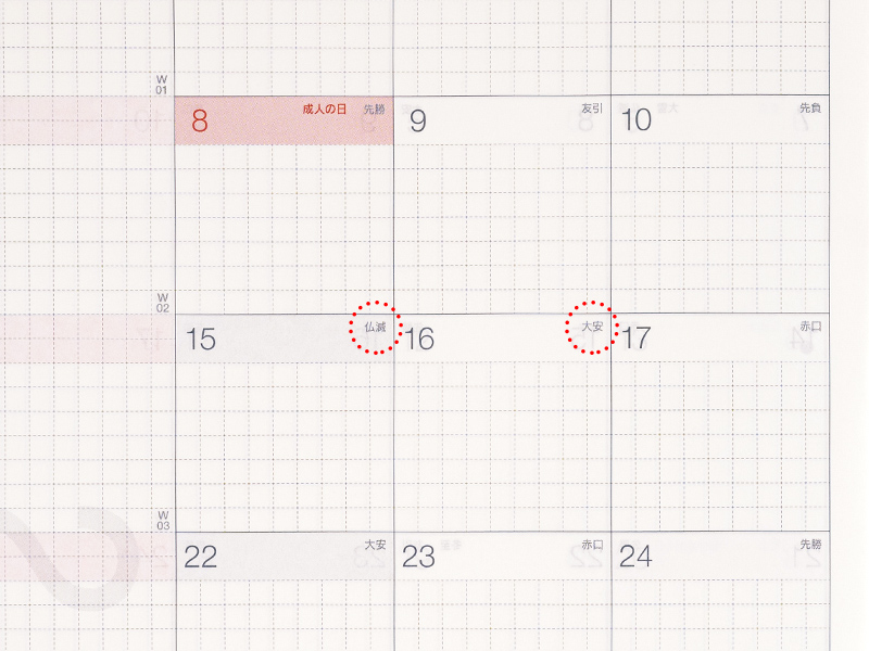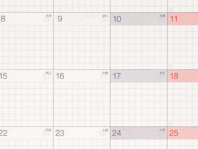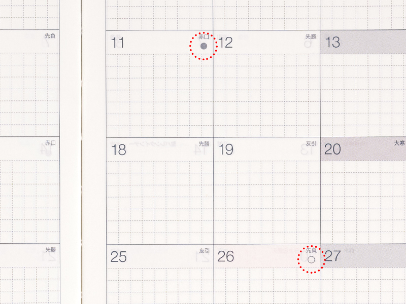 The monthly calendar days are labeled with rokuyo, a cycle of six days said to predict good or bad fortune that day. The labels are commonly found on Japanese calendars and used to plan weddings and funerals.