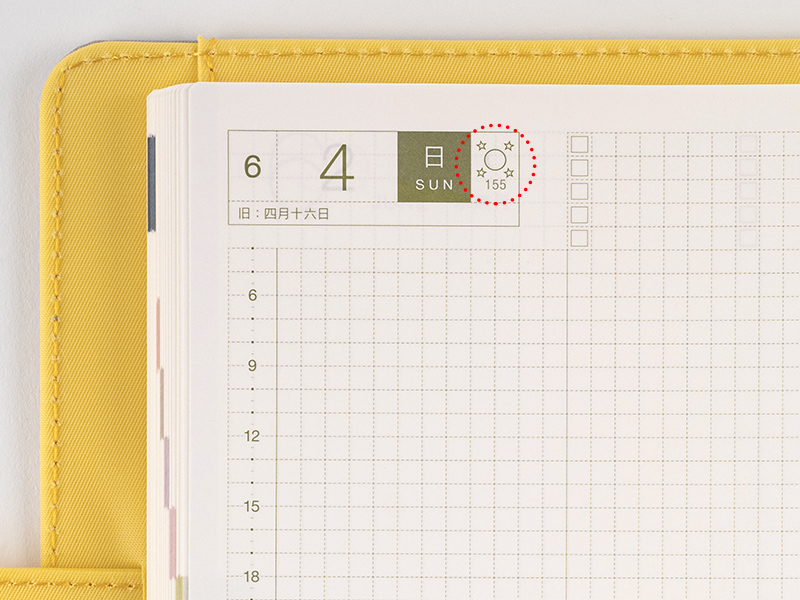The date of the old Japanese lunisolar calendar is also included under the day’s date. This calendar was used in Japan until 1873, when Japan adopted the universal Gregorian calendar. Some days in this lunisolar calendar are specified as standard days signifying the changing of the seasons. We’ve also included solar terms based on this ancient calendar.
