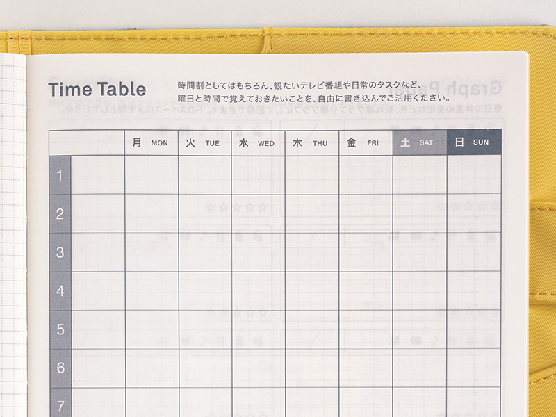 The book includes two timetables for writing in a recurring hourly schedule for each day of the week. These are useful, say, for filling in the broadcast times of favorite television shows, or splitting up house chores.