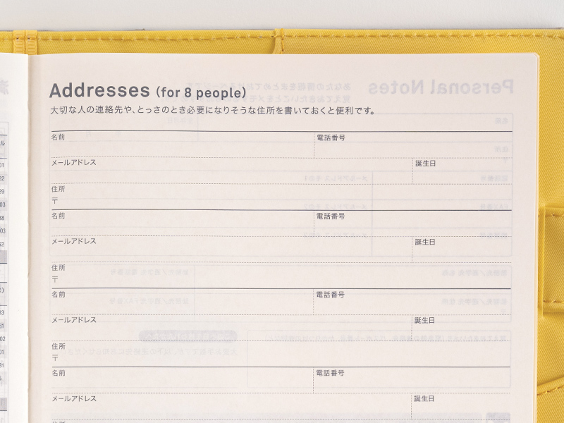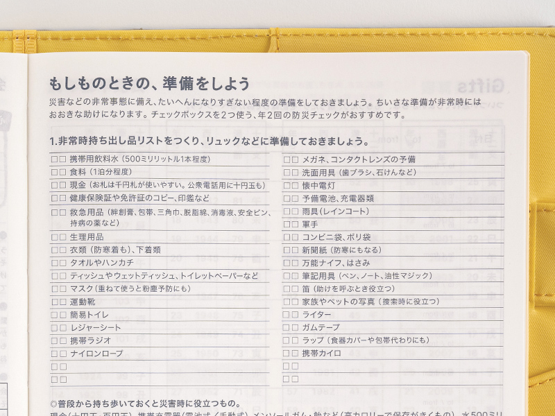 This page contains a checklist of items to have ready in case of an emergency. There is also a space to list nearby evacuation zones (common in Japan), emergency contact information and topics discussed between family and friends.