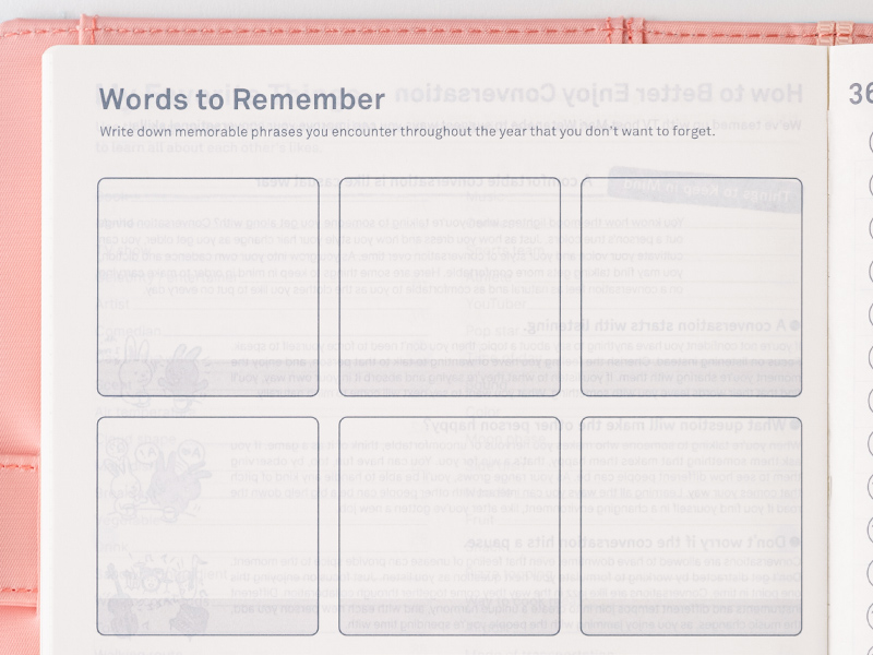 This page is exclusive to the English version. You can write down phrases and words you encountered throughout the year that you want to read back on or avoid forgetting. Use the shaded area to write down dates or citations.
