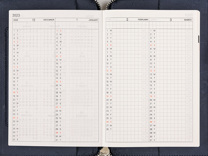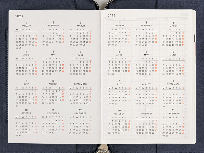 A convenient double-page spread shows the yearly calendars for 2023 and 2024 at a glance for a useful reference when planning ahead.