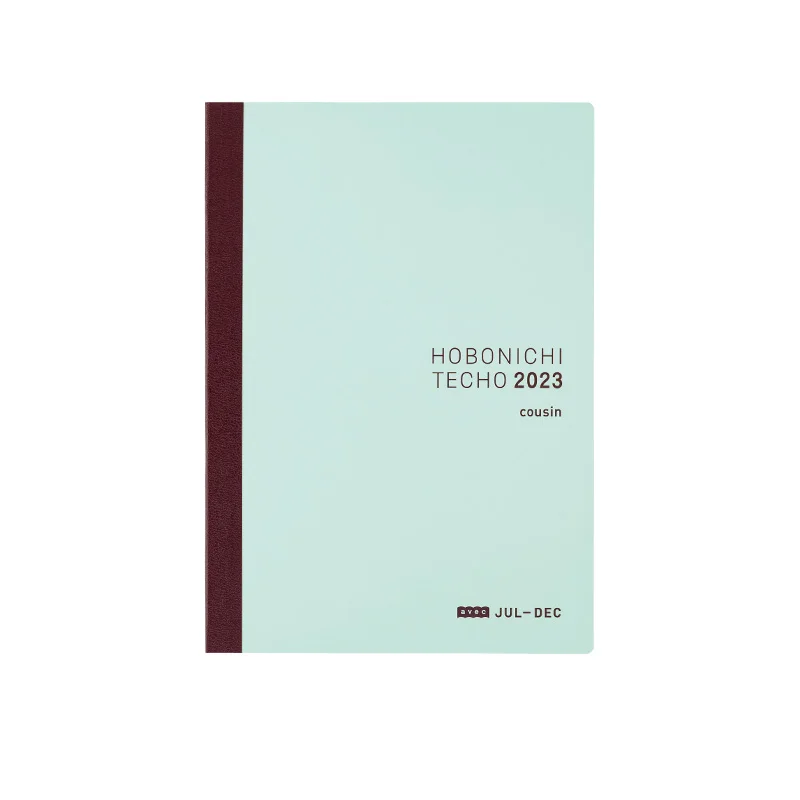 We first introduced the Avec in response to customers who struggled with bulging books after collecting a year's worth of pasted material in the daily pages. The Avec version splits the A5 Hobonichi Techo Cousin, design and all, into books of six months each with only slight variances in calendar spans and the number of extra pages in the back.