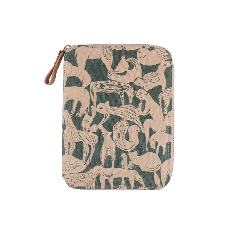 “life puzzle” is a design that features a freehand drawing of various animals connected like puzzle pieces. It is made thinking of the Earth where not only humans but all creatures live together and convey how each life is gently connected. This cover uses a special-made original textile that shrinks down the original drawing to match the size of the Hobonichi Techo covers.
