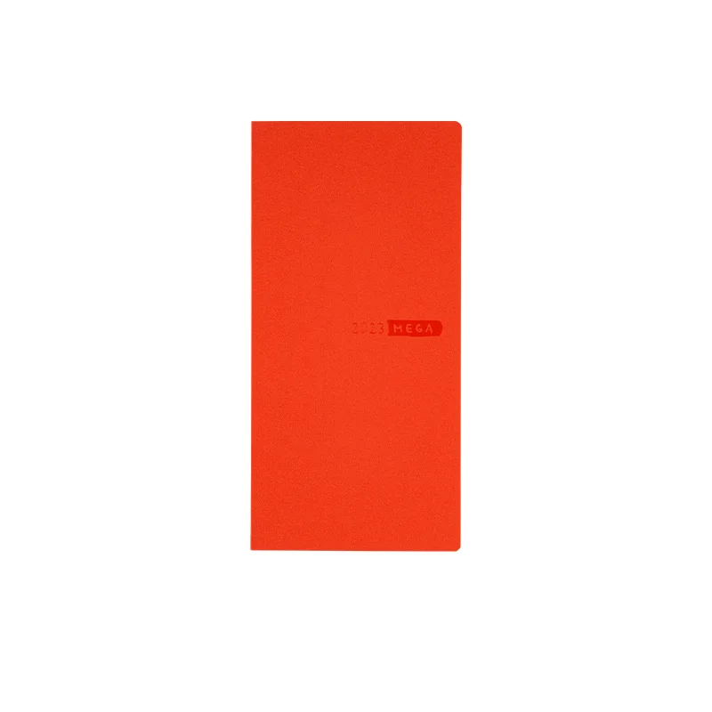 Vermillion has a striking red cover that really draws your attention. The hue is somewhere between red and orange and can provide a great accent to your work outfit in a professional setting.  The year 2023 and the Mega logo are printed on the cover in puffy letters.