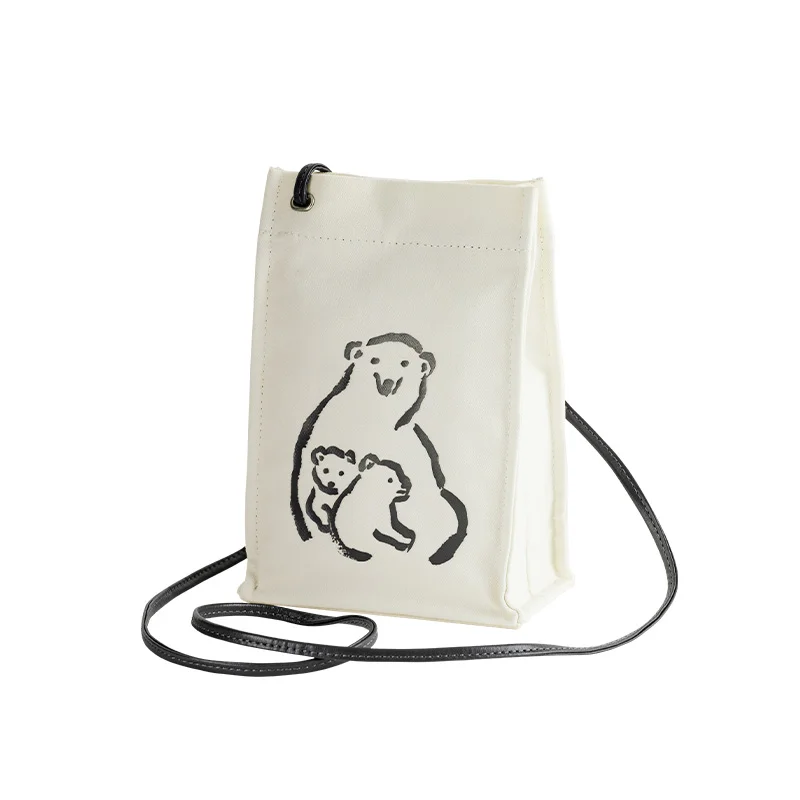 Thick, soft lines depict a polar bear standing and gazing into the distance. The back of the pouch has an innocent polar bear cub with its arms stretched out wide lying on its back. This heartwarming design can dissolve your tension and make you relaxed and content.