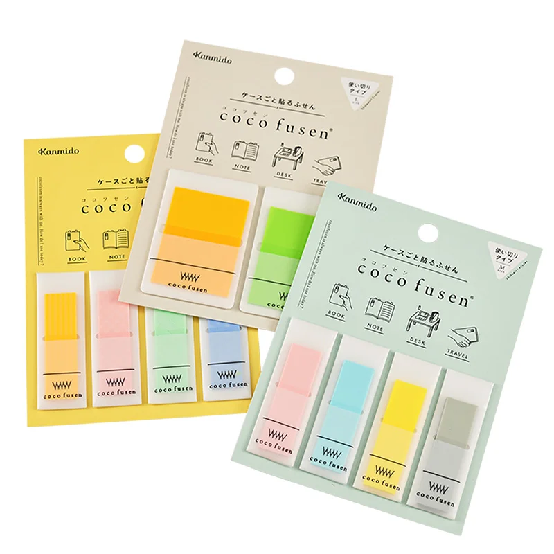 Kanmidococo fusencocofusen is a sticky note with a dispenser that pops out the next sheet every time you pull one out. The back of the dispenser has a strip of tape to attach it to the front or back page of your planner. This feature is especially useful in the Weeks book, which otherwise lacks pockets.