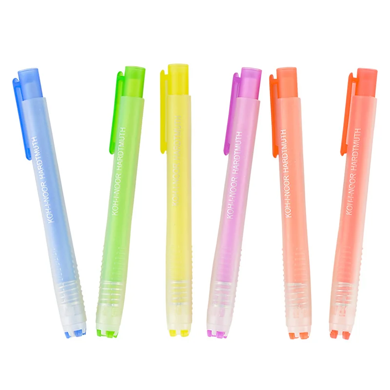 Koh-I-NoorPlastic Eraser with HolderThis eraser by the venerable Czech stationery maker Koh-I-Noor can be used by extending the retractable eraser “lead” with a click, the same way you would with a traditional mechanical pencil. This simple and quaint eraser tool comes in 6 colors: red, orange, yellow, green, blue, and purple. The translucent body is discretely printed with their logo and is equipped with a non-slip grip. The upper part has a clip that you can insert into the pen holders of the Hobonichi Techo. Also available for sale is a set of two refill eraser cores.