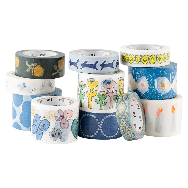 The “minä perhonen” series mt washi tape offers the characteristic warmth that can only come from hand-illustrated designs. The tape comes in a total of 16 designs, including the staple designs such as“tambourine,” “choucho” and “hana hane,” and “run run run” which shows a line of rabbits darting across the tape, and “kuro-neko” designed in the style of stamps pressed on.