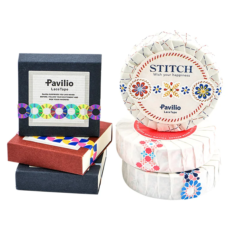 In addition to the “Standard” 15 mm rolls and “Mini” 10 mm rolls, we also have a 15 mm pastel lace-design tape called “Palette” as well as a 15 mm tape called “Stitch” that resembles embroidery.