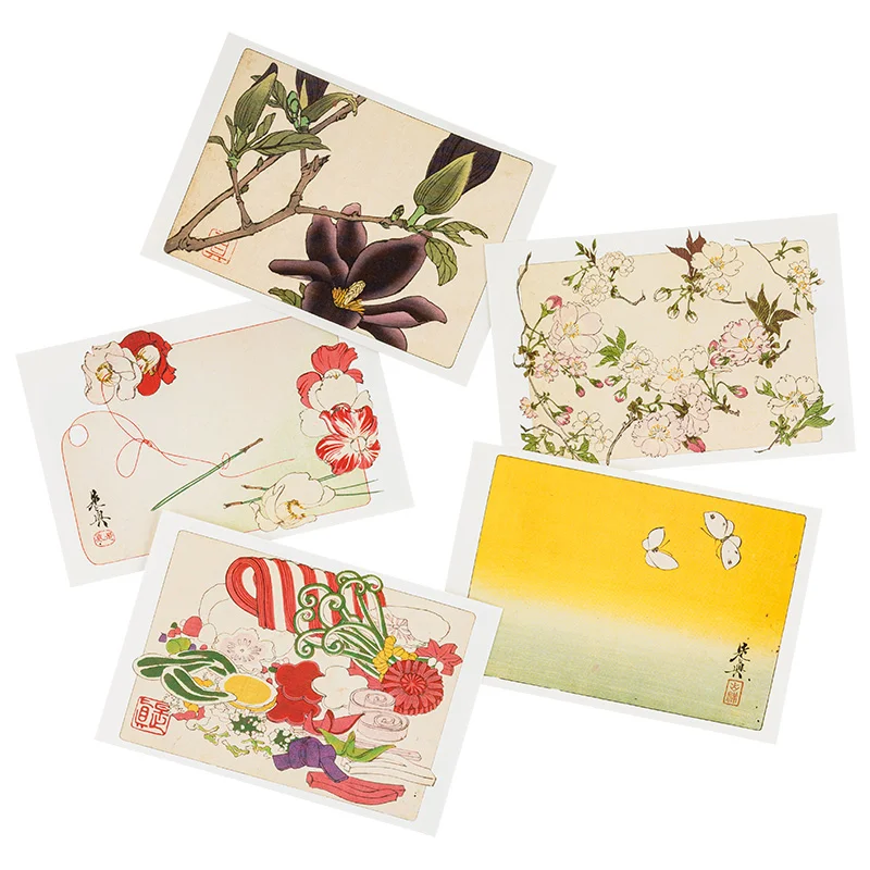Shibata Zeshin was a lacquer artist and painter from the late Edo period into the middle of the Meiji era. This set of 5 postcards features artwork selected from his famous Tairyukyo Gafu collection. It includes two designs featured on techo covers this year: “Small White Butterfly” on an A6 size techo cover, and “Plate of Confectionaries” on a Weeks book.