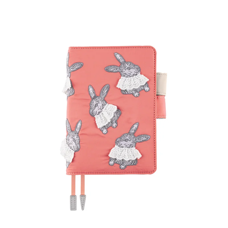 We made a simple tote bag to match the Candy Stripper techo cover Sweet Bunny. The textile has rabbits with their feet lined up embroidered all across it. Real cotton lace is used for their collars.