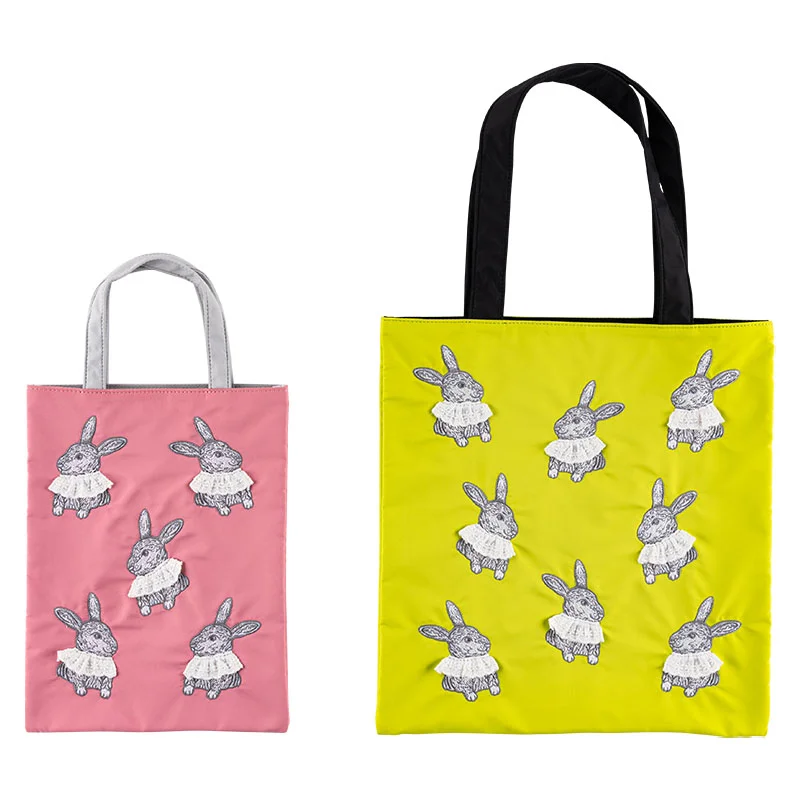We hope you choose this tote bag filled with rabbits to accent your outfit.