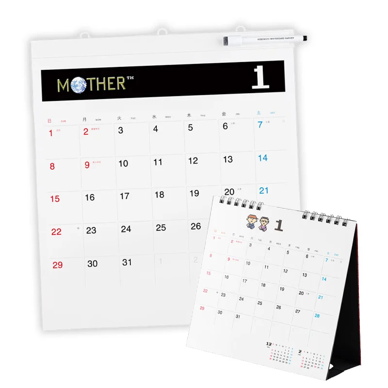 The Desktop size includes characters from across the MOTHER trilogy. The double-sided pages are made with whiteboard paper, with one side a calendar with repeating images of characters from the game, the opposite side a white calendar with single images of those characters and plenty of room to write. In other words, you get one calendar with two designs.