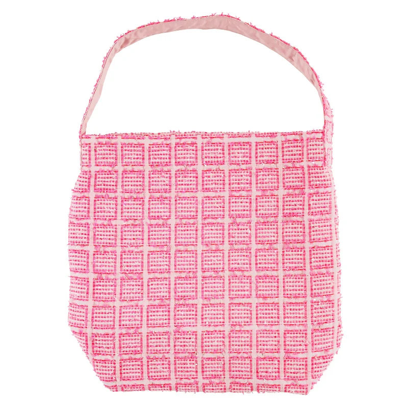 The tote bag is reversible, with the front blooming with roses and the back with a calming pink. The pink side includes a large pocket to sort your bag inside.