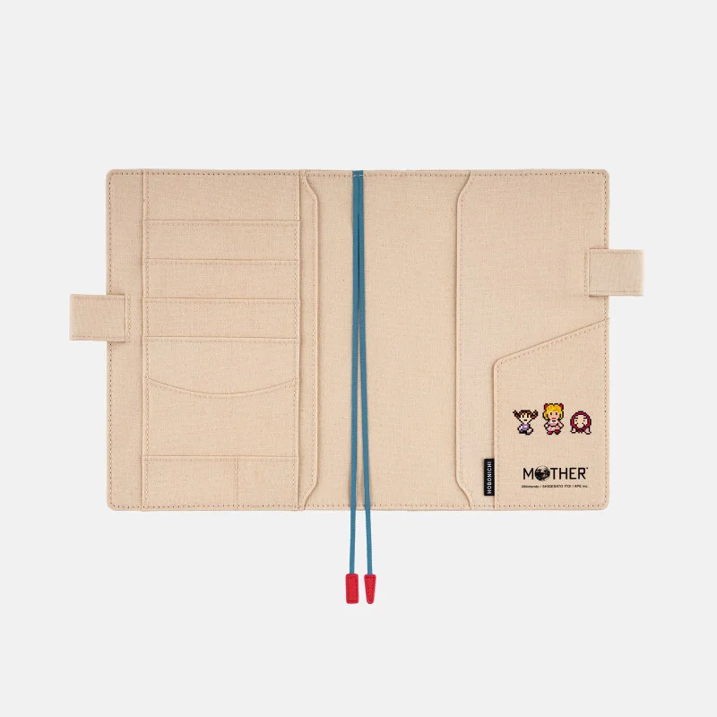 This cover design is based on Shigesato Itoi's 1994 Super Nintendo game, MOTHER 2 (EarthBound in North America). It’s made from a natural-colored canvas material adorned with an embroidered Franklin Badge patch that gives it a satisfying three-dimensional feel. If you tip the cover and view the patch at different angles, you’ll see the way its threads sparkle.