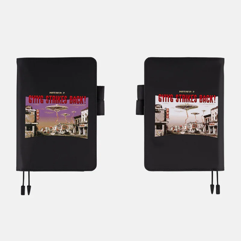 This cover design is based on Shigesato Itoi's 1994 Super Nintendo game, MOTHER 2 (EarthBound in North America). It features a stark black polyester background printed with the intro scene from MOTHER 2. Its cinematic layout and UFO imagery makes this scene resemble a sci-fi movie at a theater and gives us a peek at the magnificent story that’s about to begin. The phrase on the cover is the subtitle of the Japanese MOTHER 2 game, Gyiyg Strikes Back (localized in EarthBound as The War Against Giygas!)