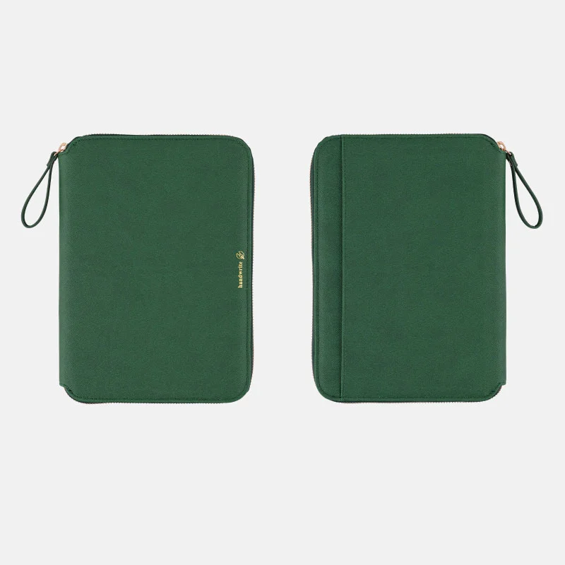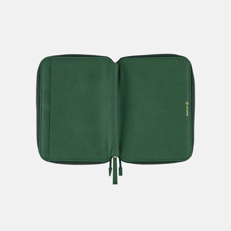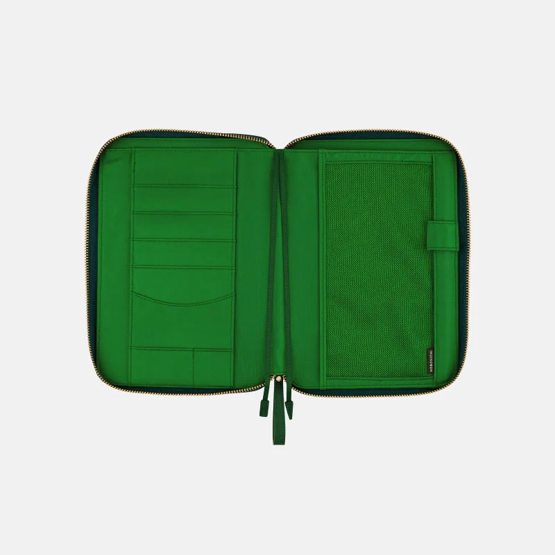 The cover interior is also an elegant shade of deep green. The zipper pull uses the same material as the cover for an overall stylish look.