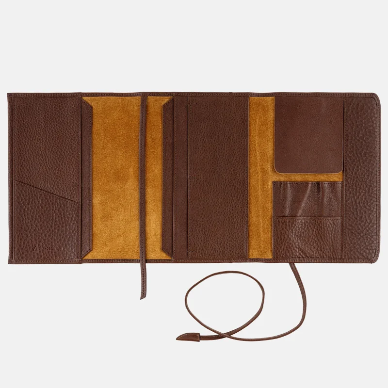 The cover is closed by wrapping a leather string around it. Enjoy taking your time to unwind the leather strap to open your techo and fastening it shut.